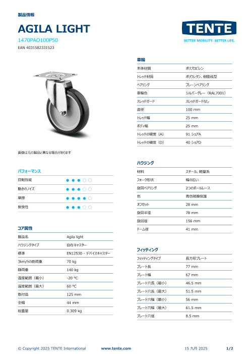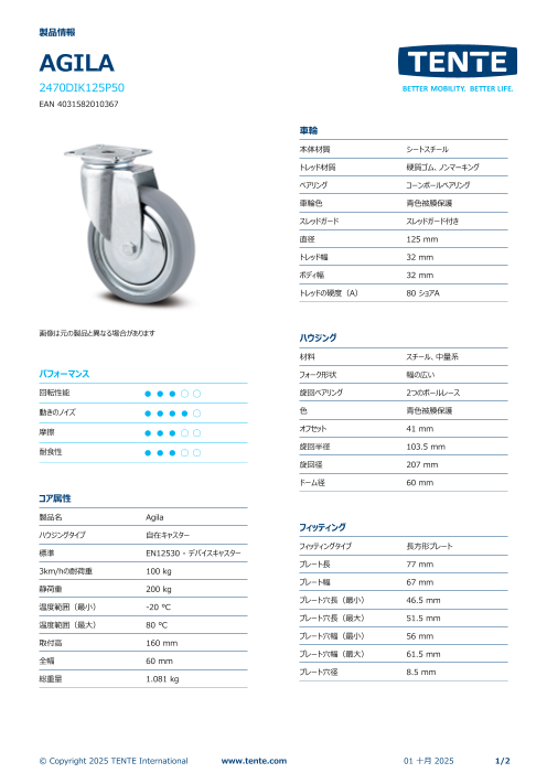 AGILA 自在キャスター、車輪径100mm、耐荷重70kg
