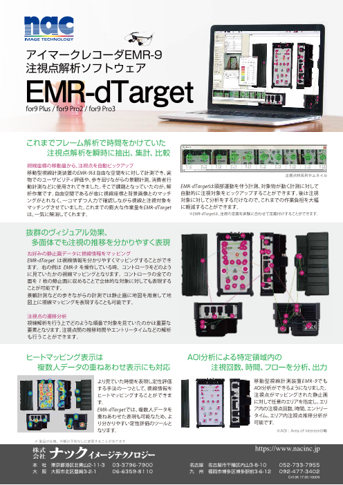 ・これまでフレーム解析で時間をかけていた注視点解析を瞬時に抽出、集計、比較 ・抜群のヴィジュアル効果、多面体でも注視の推移を分かりやすく表現 ・ヒートマッピング表示は複数人データの重ねあわせ表示にも対応 ・AOI分析による特定領域内の注視回数、時間...