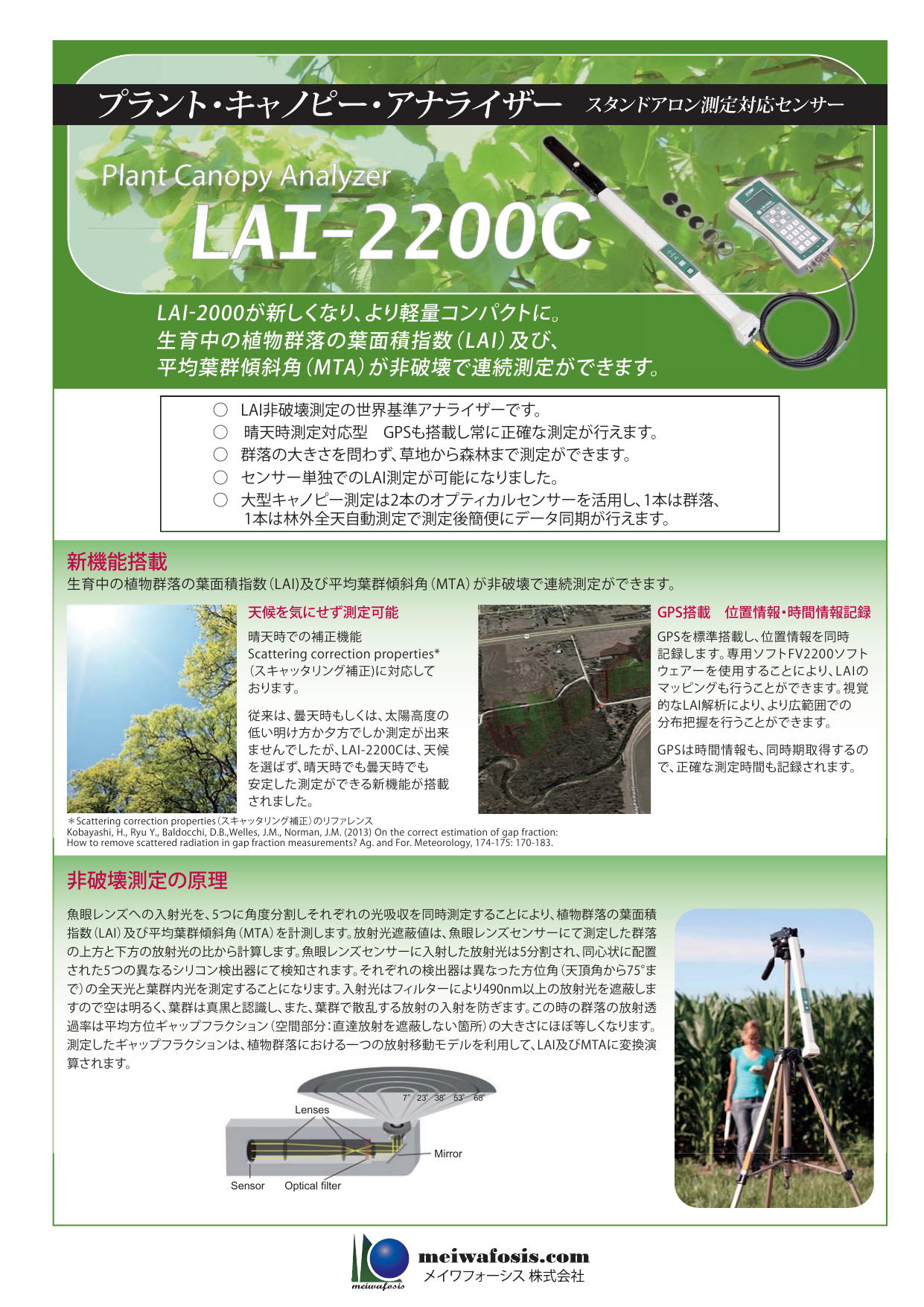 ●LAI非破壊測定のスタンダード、LAI-2000の後継機 ●センサー単独でもLAI測定が可能になりました。センサー部はメモリーを保有し自動測定可能です。 ●乾電池駆動で、野外現場で迅速な測定ができます。 ●群落の大きさを問わず、草地から森林ま...
