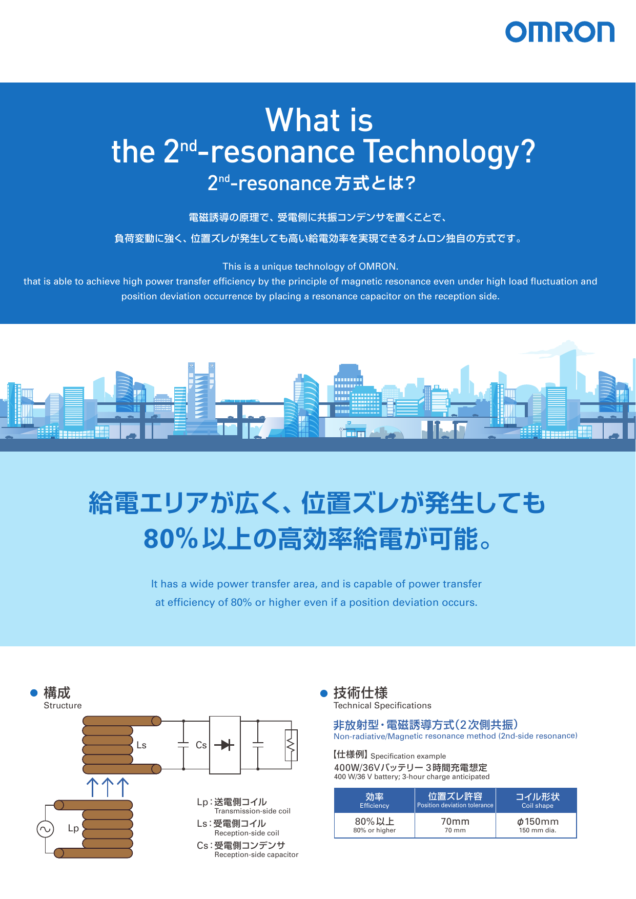 2nd-resonance方式とは、電磁誘導の原理で、受電側に共振コンデンサを置くことで、負荷変動に強く、位置ズレが発生しても高い給電効率を実現できるオムロン独自の方式です。 【特徴】 ○位置ズレに強い ○法規制にも柔軟に対応