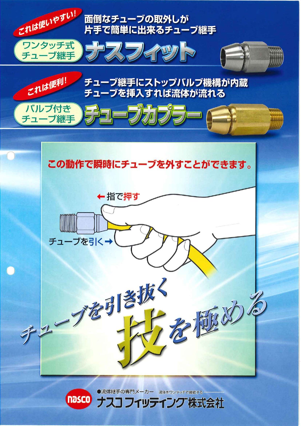 ・片手で取外しができるチューブ継手 ナスフィット チューブの取外しに便利なロングプッシャー採用により取外しが容易になりました。 ・バルブ付きチューブ継手 チューブカプラー チューブ継手の内部にカプラー機構のストップバルブ内蔵。 チューブを差し...