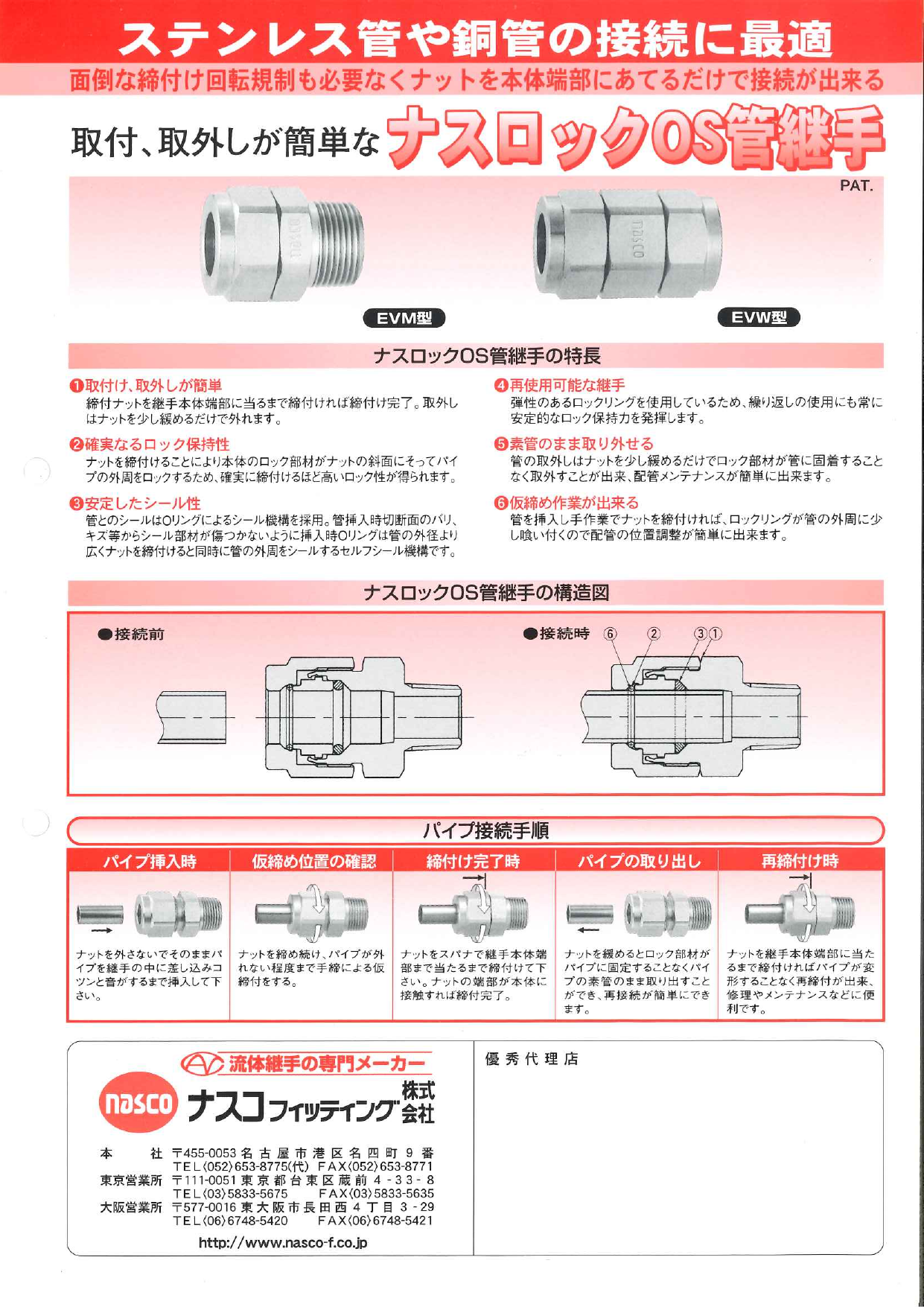 ・取付、取外しが簡単な ナスロックOS管継手 ステンレス管や銅管の接続に最適 面倒な締付け回転規制も必要なくナットを本体端部にあてるだけで接続が出来ます。 ・ナスコーン シリコンホース継手 シリコンホースの接続金具もカシメ方式から分解洗浄が出...