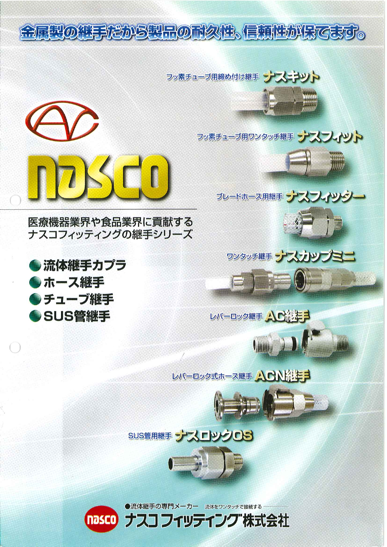 ナスコフィッティングは各種ワンタッチ式流体継手カプラーやホース継手やチューブ継手の日本でも数少ない流体継手の専門メーカーです。 当社の独創的な接続コネクター技術は、一般産業分野をはじめ自動車業界、電子機器分野、冷凍空調分野など非常に幅広い分野に活躍致し...