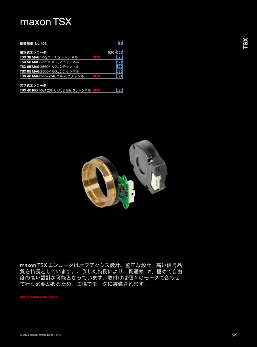maxon TSX エンコーダはオフアクシス設計、堅牢な設計、高い信号品質を特長としています。こうした特長により、貫通軸 や、極めて自由度の高い設計が可能となっています。取付けは個々のモータに合わせて行う必要があるため、工場でモータに装備されます。