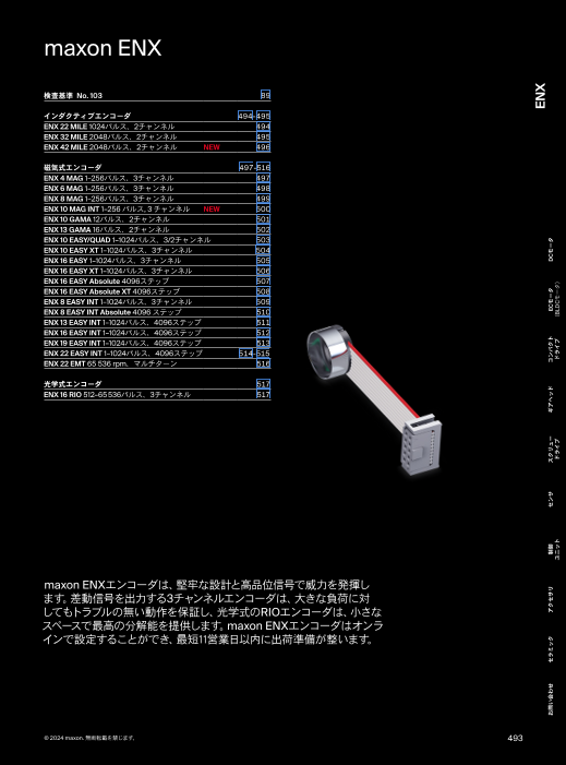 maxon ENXエンコーダは、堅牢な設計と高品位信号で威力を発揮します。差動信号を出力する3チャンネルエンコーダは、大きな負荷に対してもトラブルの無い動作を保証し、光学式のRIOエンコーダは、小さなスペースで最高の分解能を提供します。