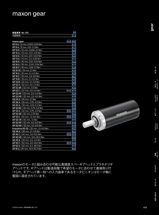 maxonのモータと組み合わせ可能な高精度スパーギアヘッドとプラネタリギアヘッドです。ギアヘッドは製造段階で希望のモータに合わせて直接取り付 けられ、ギアヘッド第一段への入力歯車であるモータピニオンはモータ軸に堅固に固定されています。