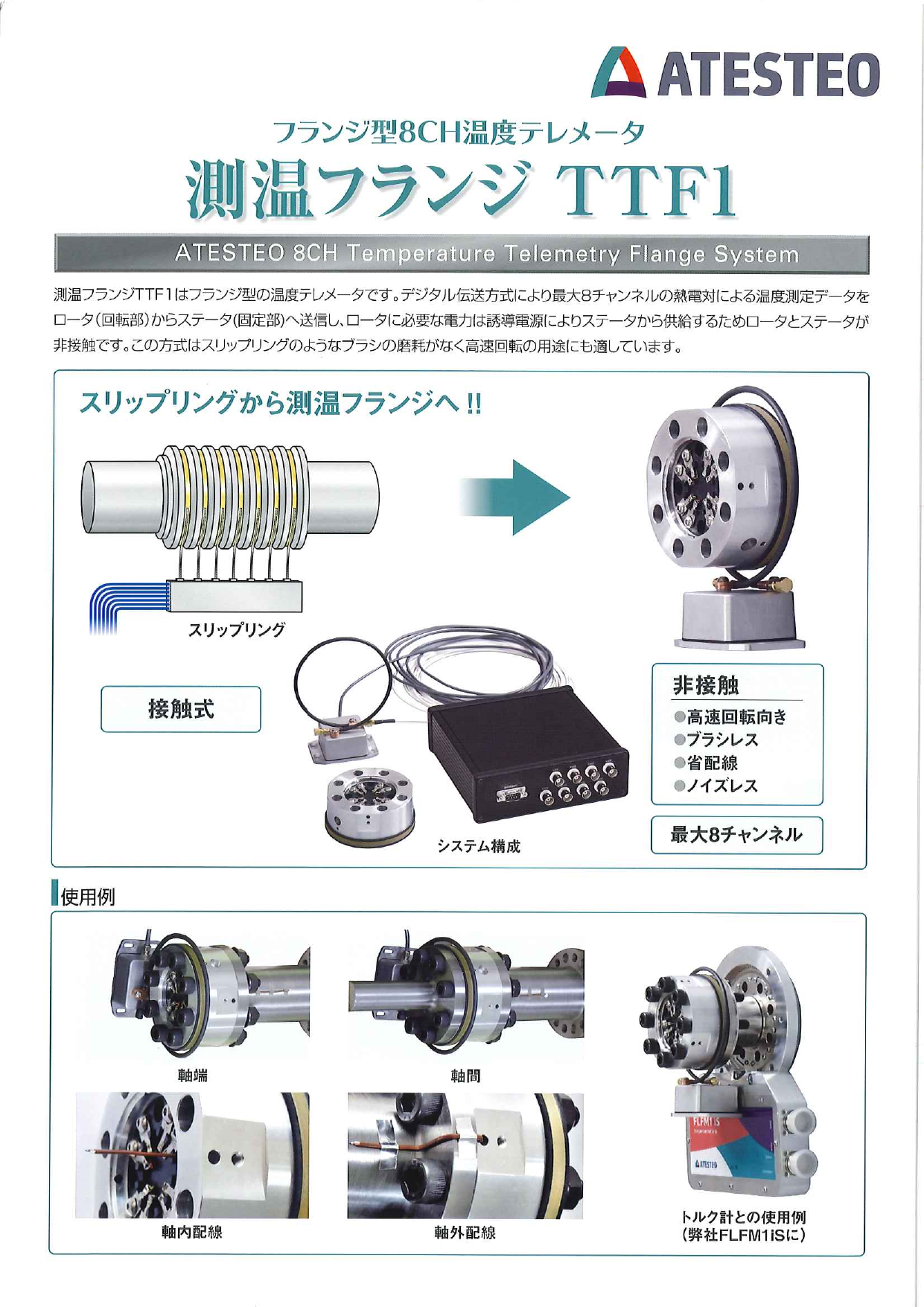 測温フランジTTF1はフランジ型の温度テレメータです。 デジタル伝送方式により最大8チャンネルの熱電対による温度測定データを ロータ(回転部)からステータ(固定部)へ送信し、ロータに必要な電力は誘導電源 によりステータから供給するためロータとステー...