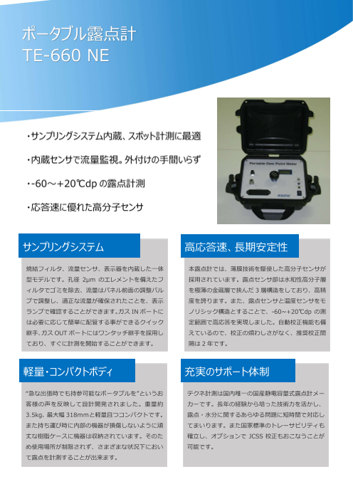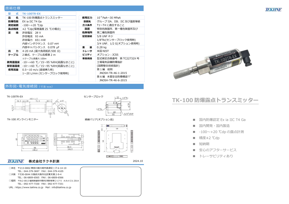 ● 国内開発・国内製造・国内校正 ● 日本国内防爆(TIIS)認定を取得 ● -100~+20 ℃dpの露点測定範囲 ● 精度±2 ℃dp ● 高応答速 ● 競争力ある価格体系 ● 短納期 ● 充実のサポート体制 ● 国家標準へのトレーサ...