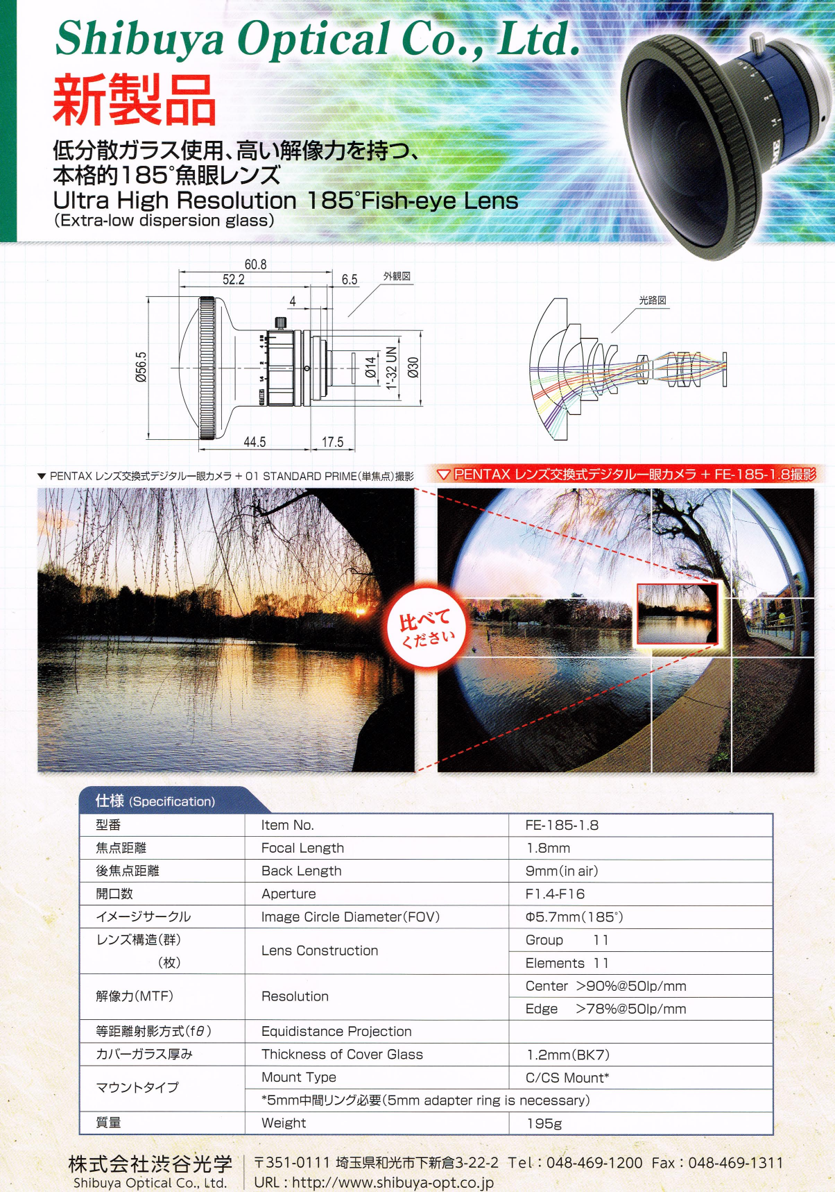 低分散ガラス使用、高い解像力を持つ、本格的185°魚眼レンズ