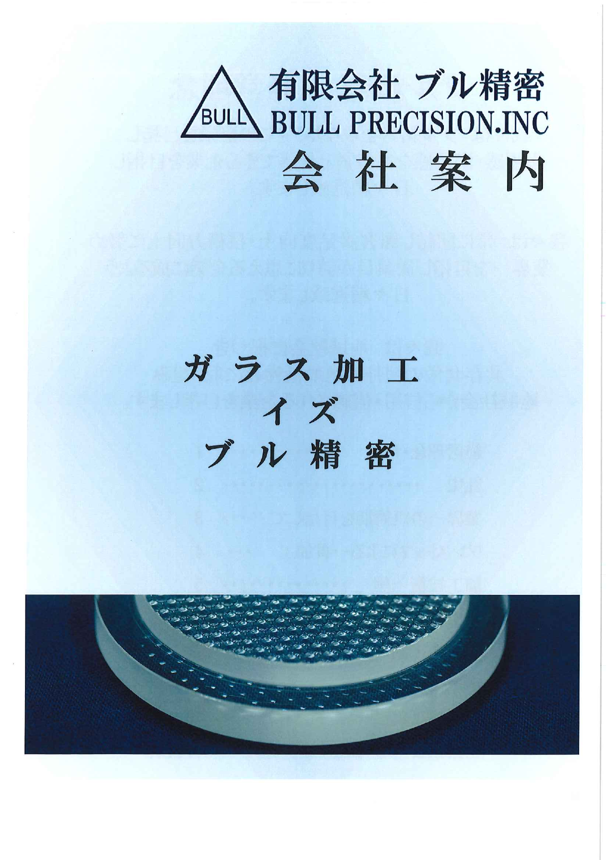 【掲載内容】 ・経営理念 ・社史 ・当社加工技術一例 ・取り扱い硝材例 ・製品加工例 ・主要加工設備一覧 ・企業概要 など 有限会社 ブル精密は 精研削法による非球面レンズ研磨加工・特殊形状超特急加工を常に追求する 光学硝子・成型...