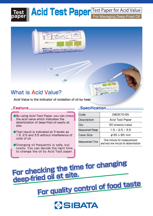 AV試験紙は“フライヤー油の劣化具合を表す酸価値”を現場で簡単に測定できる試験紙です。 ◆判定は酸価値1.5、2.5、3.5の3段階で、油の色の影響を受けづらく測定できます。 ◆『弁当及びそうざいの衛生規範』(昭和54年6月29日...