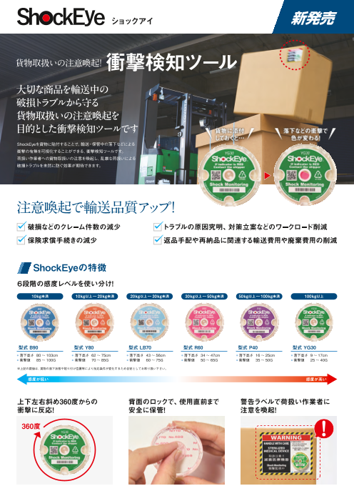 注意喚起で輸送品質アップ! ・破損などのクレーム件数の減少 ・保険求償手続きの減少 ・トラブルの原因究明、対策立案などのワークロード削減 ・返品手配や再納品に関連する輸送費用や廃棄費用の削減 ◆詳細はカタログをダウンロードしご覧いただく...