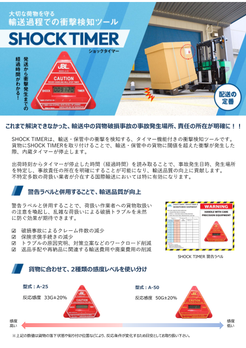 SHOCK TIMERは、輸送・保管中の衝撃を検知する、タイマー機能付きの衝撃検知ツールです。 貨物にSHOCK TIMERを取り付けることで、輸送・保管中の貨物に閾値を超えた衝撃が発生した 際、内蔵タイマーが停止します。 出荷時刻からタイマーが停...