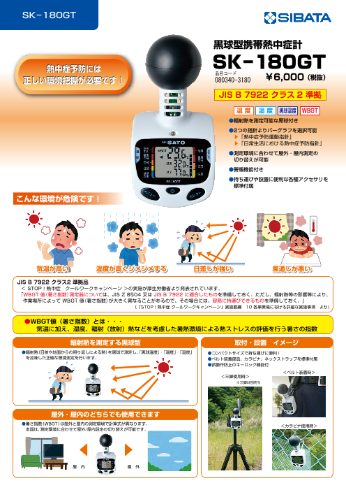 JIS B 7922 クラス 2 準拠 ◆輻射熱を測定可能な黒球付き ◆2つの指針よりバーグラフを選択可能 「熱中症予防運動指針」 「日常生活における熱中症予防指針」 ◆測定環境に合わせて屋外・屋内測定の切り替えが可能 ◆警...