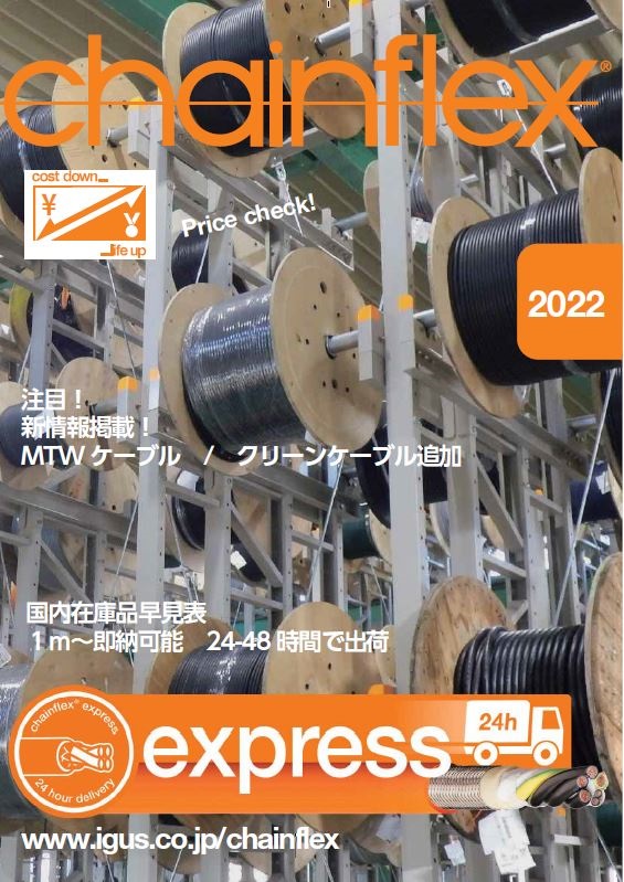 チェーンフレックス エクスプレスカタログ 2022は、ロボットケーブル「チェーンフレックス」の、国内在庫品の型式一覧を掲載したカタログです。 即納可能なロボットケーブルの型式一式をスペックと共に知りたいときに便利です。早見表付き。 イグス...