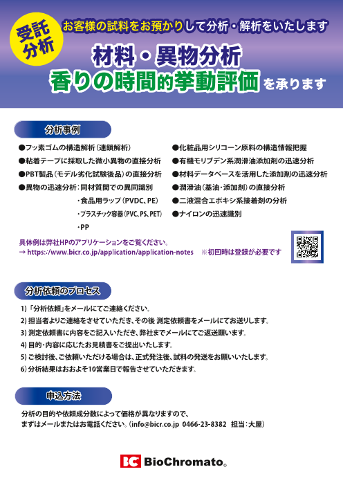 ・フッ素ゴムの構造解析(連鎖解析) ・粘着テープに採取した微小異物の直接分析 ・PBT製品(モデル劣化試験後品)の直接分析 ・異物の迅速分析:同材質間での異同識別(食品用ラップ「PVDC、PE」、プラスチック容器「PVC、PS、PET」、PP) ...
