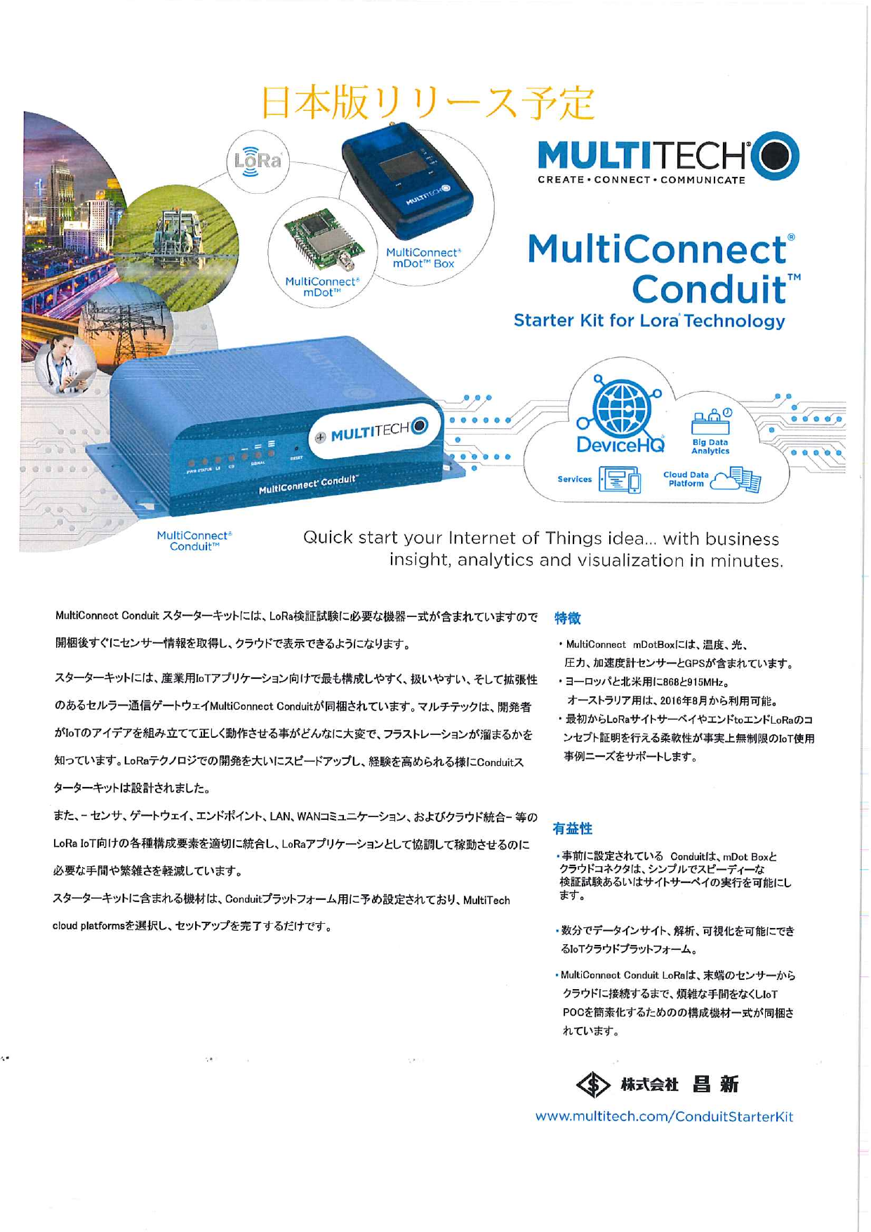 ・MultiConnect Conduitスターターキット MultiConnect Conduitスターターキットには、LoRa検証試験に必要な 機器一式が含まれていますので開梱後すぐにセンサー情報を取得し、 クラウドで表示できるようになり...