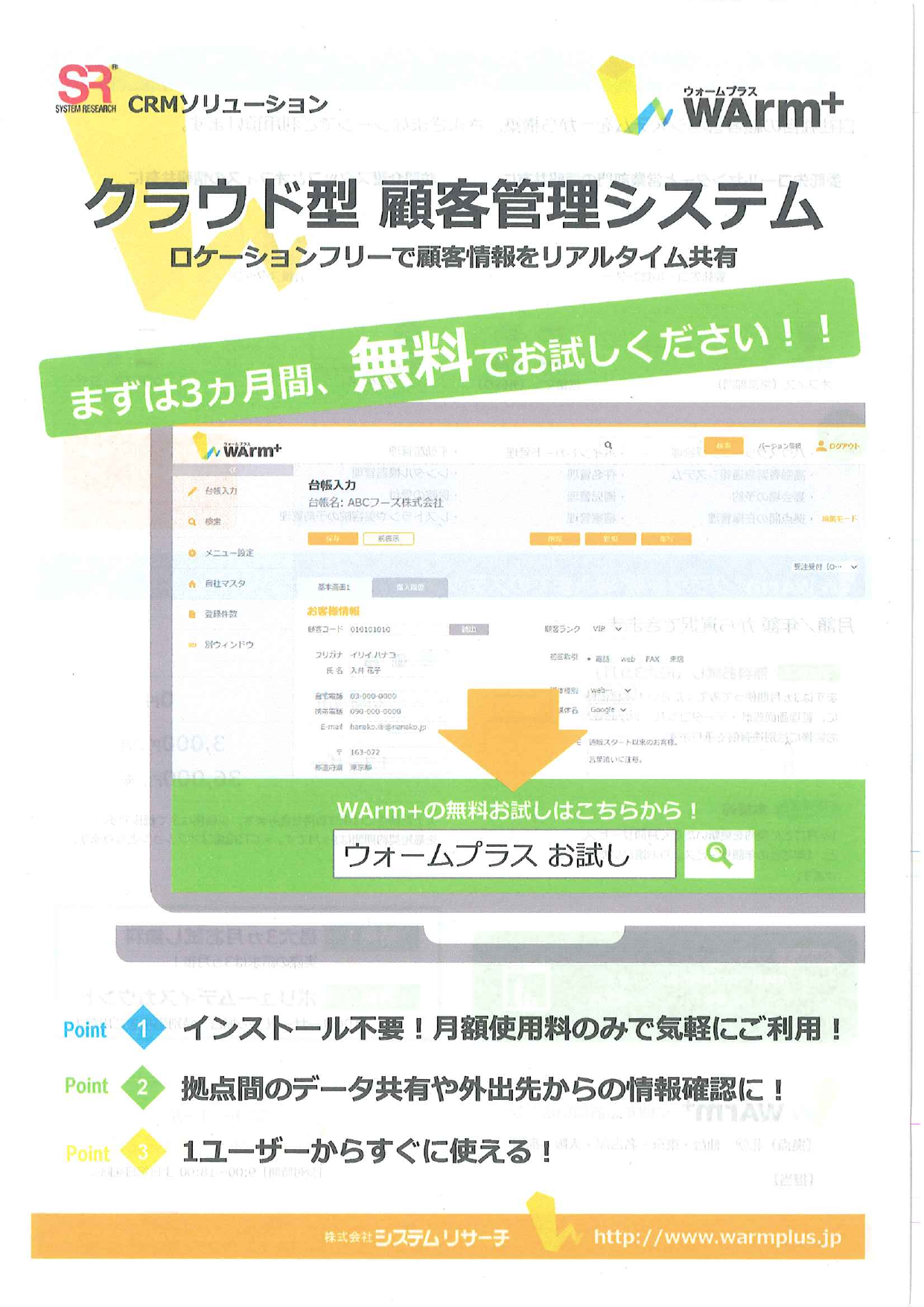 クラウド型 顧客管理システム ウォームプラス WArm+ ・ロケーションフリーで顧客情報をリアルタイム共有 ・インストール不要!月額使用料のみで気軽にご利用! ・拠点間のデータ共有や外出先からの情報確認に! ・1ユーザーからすぐに使える! ...