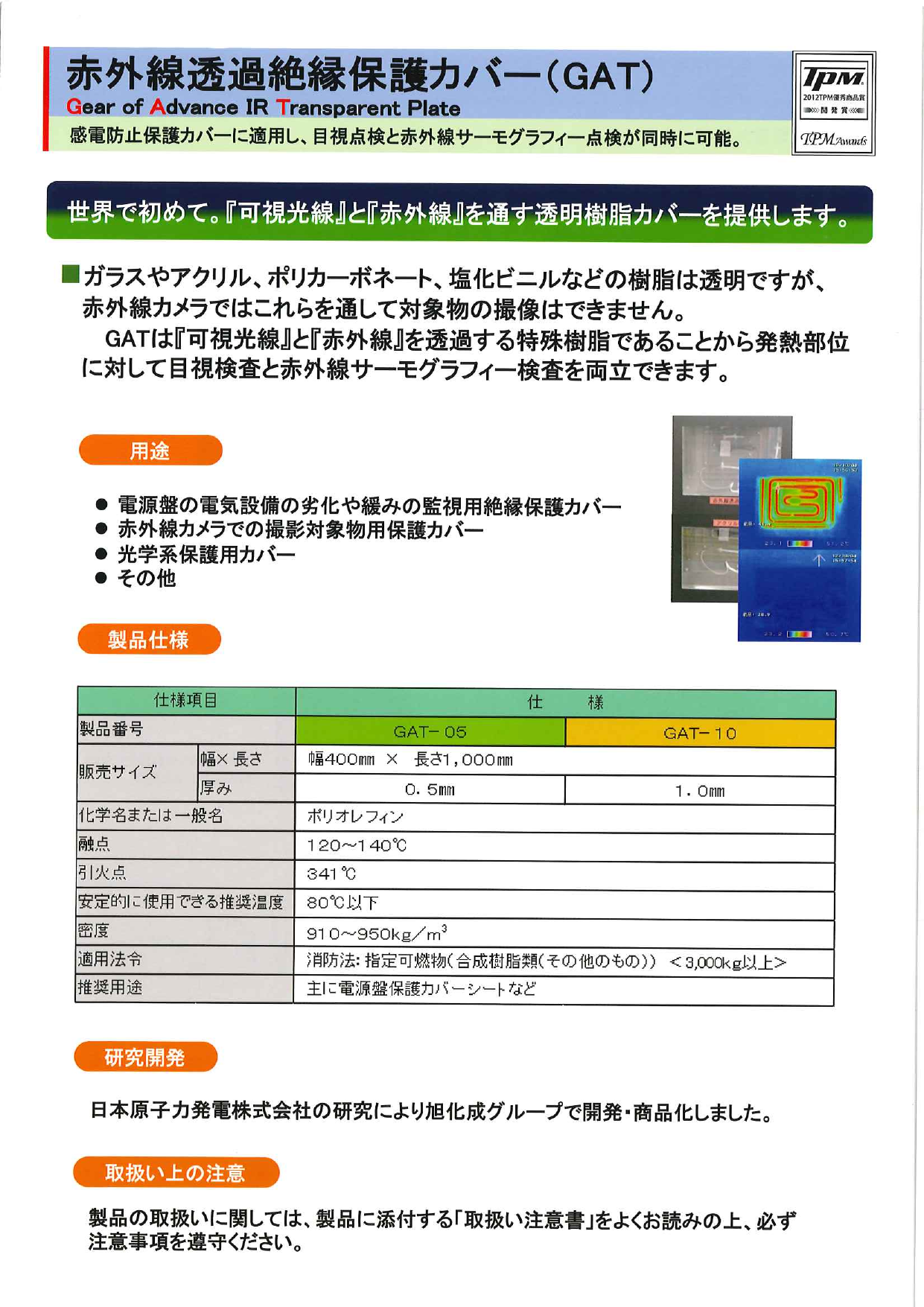 ガラスやアクリル、ポリカーボネート、塩化ビニルなどの樹脂は透明ですが、赤外線カメラではこれらを通して対象物の撮像はできません。 GATは『可視光線』と『赤外線』を透過する特殊樹脂であることから発熱部位に対して目視検査と赤外線サーモグラフィー検査を両立で...
