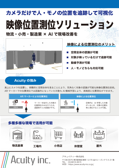 エリア内を撮像できる箇所にカメラを設置し、俯瞰的に空間全体を見ることにより、死角なく対象の認識が可能な映像位置測位技術。ARマーカーでの位置測位では認識外になっていた対象も、AI機械学習により、高精度に位置測位ができます。 カメラの撮像エリア内に、機械...