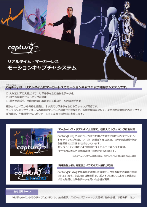 Captury(キャプチュリー)は、リアルタイムにマーカーレスでモーションキャプチャが可能なシステムです。 複数台のカメラから骨格認識を行うことで、3次元的なトラッキングを実現します。 計測範囲内に入るだけで即座にスケルトンを認識して計測がはじめられ...