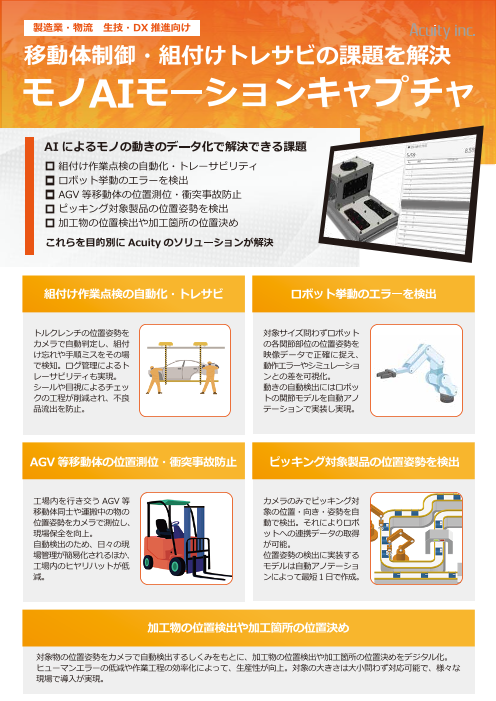 AIによるモノの動きのデータ化で ■組付け作業点検の自動化・トレーサビリティ ■ロボット挙動のエラーを検出 ■AGV等移動体の位置測位・衝突事故防止 ■ピッキング対象製品の位置姿勢を検出 ■加工物の位置検出や加工箇所の位置決め