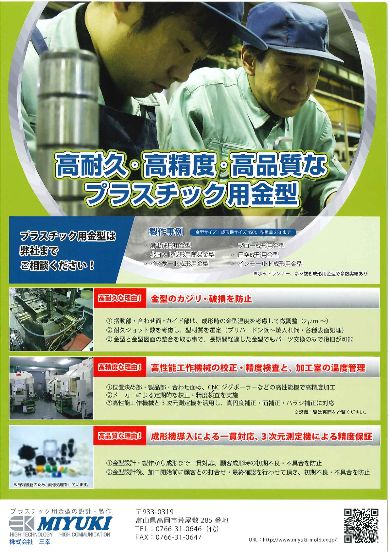 ・高耐久な理由!金型のカジリ・破損を防止 ・高精度な理由!高性能工作機械の校正・精度検査と、加工室の温度管理 ・高品質な理由!成形機導入による一貫対応、3次元測定機による精度保証