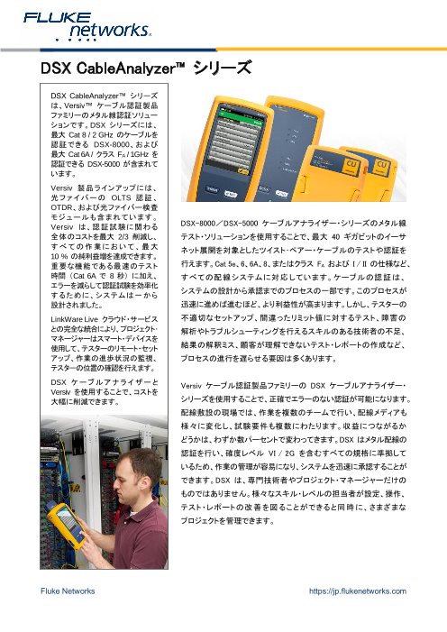 【DSX-8000】 *メタル LAN 配線の認証試験に関する過程のあらゆる手順を迅速化するケーブルテスター 【CertiFiber® Pro】 *光ファイバー配線の認証試験に関する過程のあらゆる手順を迅速化する光損失測定セット 【Opt...