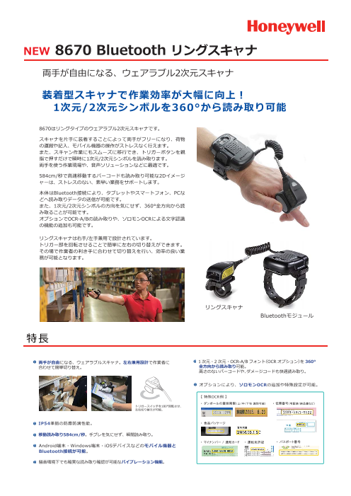 8670はリングタイプのウェアラブル2次元スキャナです。 スキャナを⽚⼿に装着することによって両⼿がフリーになり、荷物 の運搬や記⼊、モバイル機器の操作がストレスなく⾏えます。 また、スキャン作業にもスムーズに移⾏でき、トリガーボタンを親 指で押...