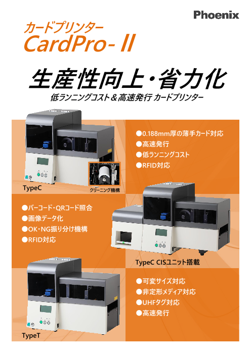 ◆TypeC ・0.188mm厚の薄手カード対応 ・高速発行 ・低ランニングコスト ・RFID対応 ◆TypeC CISユニット搭載 ・バーコード・QRコード照合 ・画像データ化 ・OK・NG振り分け機構 ・RFID対応 ...