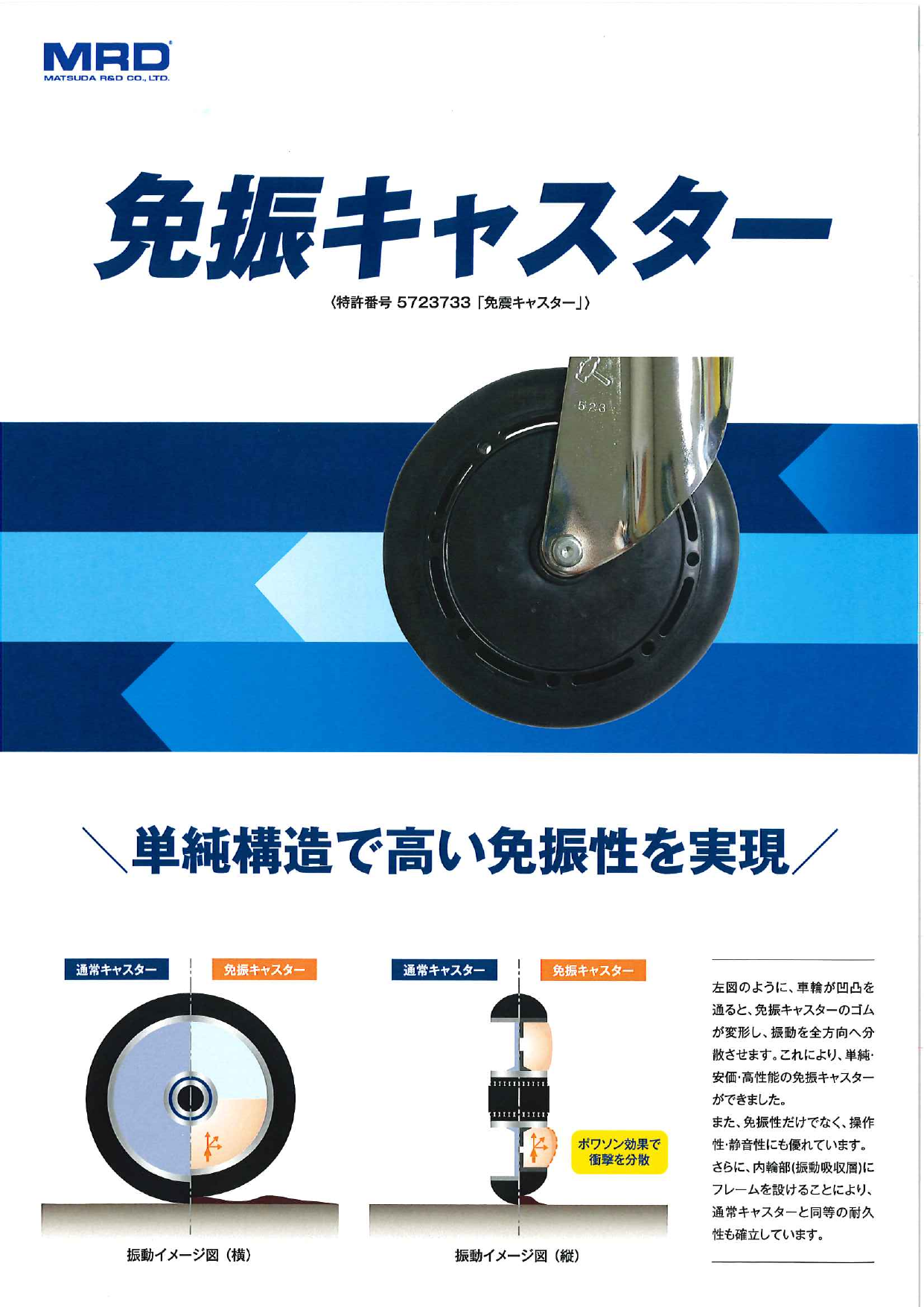 特許番号5723733( 「免振キャスター」 ) 「防振・静音・軽い操作」 3つの特長を同時に実現しました。 車輪が凸凹を通ると、免振キャスターのゴムが変形し、振動を全方向へ分散させます。これにより、単純・安価・高性能の免振キャスターができま...