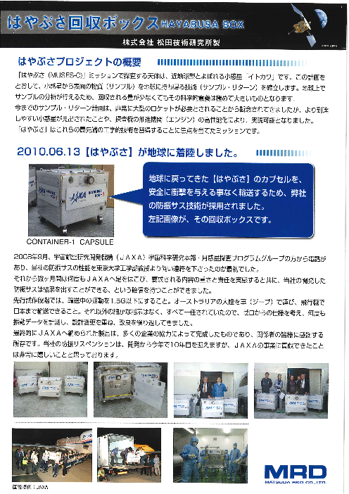 地球に戻ってきた「はやぶさ」のカプセルを、安全に衝撃を与える事なく輸送するため、弊社...