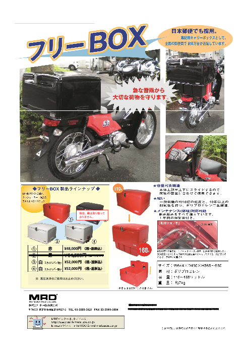 全国で110万台の納入実績!誰でも一度は見たことがある集配用キャリーボックス。 個人・法人様向けに販売を開始しました。 大容量と機能性を併せ持ったバイク用リアボックスを是非ご利用ください。 郵便局での過酷な使用に裏付けされた確かな品質と耐久性に...