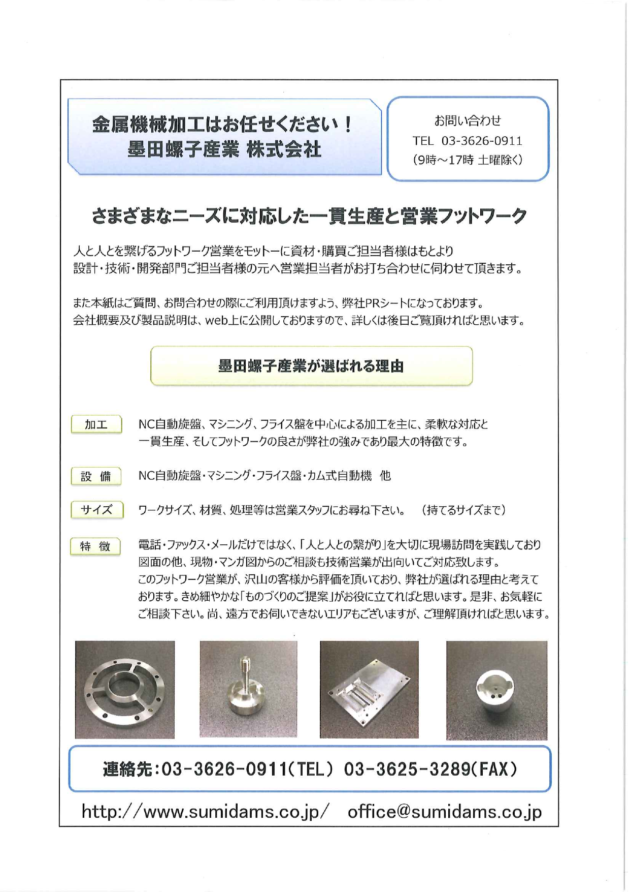 ・さまざまなニーズに対応した一貫生産と営業フットワーク ・墨田螺子産業が選はれる理由 加工 NC自動旋盤・マシニング・フライス盤を中心による加工を主に・柔軟な対応と 一貫生産、そしてフットワークの良さが弊社の強みであり最大の特徴です。 ...