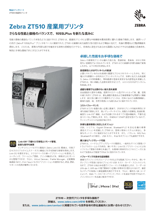 ・高信頼性 によるダウンタイムの削減 必要とされて いるのはお客様の重要なプロセスをサポートしながら、常に増大する需要の一歩先を行くプリンタシステムです。世界に名だたる高品質なZebra の印刷機構と、常時最適な性能を実現する内部部品を搭載したZT5...