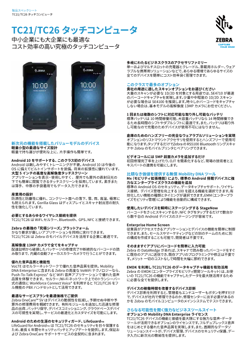 ZebraのTC21/TC26タッチコンピュータは、ビジネスに最適な機能、最適な耐久性、最適なビジネス用途のアクセサリ、業界で最も包括的で強力な付加価値の高いソフトウェアツールを提供することにより生産性を向上します。 低コストの携帯電話では、業務に使用...