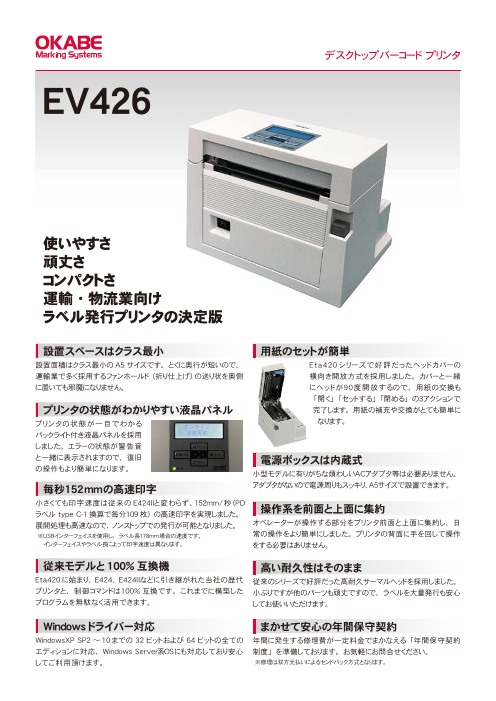 EV426は小型でシンプルな感熱プリンタです。 PDラベル・送り状ラベル・SCMラベルなど日々の大量ラベル印刷にも耐えられるダイレクトサーマルプリンタです。 152mm/ 秒(PDラベル type C-1 換算で毎分109 枚)の高速印字を実現し、ラ...