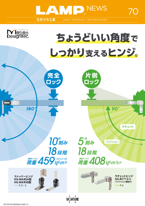 18段階角度調整可能なヒンジが2種類登場しました。 ストッパーヒンジ HG- MA95A型、HG-MA95B型 用途:分析装置、タッチパネルの角度調整 ●レバー操作で簡単に角度調整ができるストッパー付のヒンジです。 ●ギアによるロック(10°...