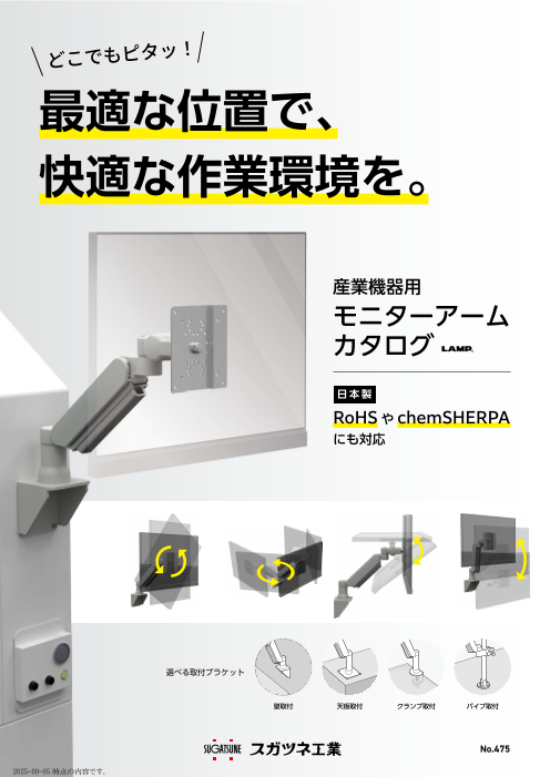 この冊子は、お客様の課題に対してスガツネ工業の機構部品で解決した事例をご紹介しております。 こんな課題をお持ちの方におすすめ!▼ ・機器の移動時にキャスターでケーブルを踏んでしまう ・キャスターに髪の毛、ホコリが絡まって動きが悪くなる ・要求...