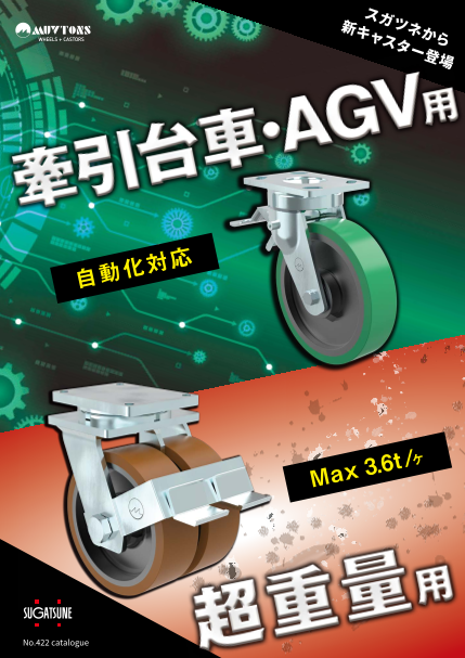 ムブトンキャスター3つの特長 1.【超重量用】 標準在庫品の最大荷重は3.6t/ヶ。 重量物の運搬にも使用される電動台車・EV台車などの電動物流機器のキャスターに最適。 受注対応で、11t/ヶ(=台車33t)も対応可能。 物流現場の特殊...