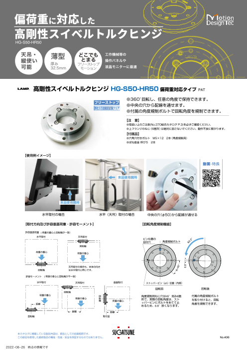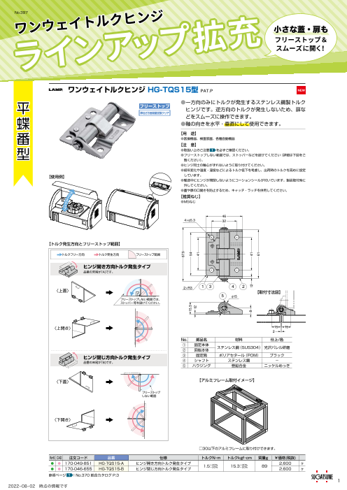 ・一方向のみにトルクが発生するステンレス鋼製トルクヒンジです。 ・逆方向のトルクが発生しないため、扉などをスムーズに操作できます。 ・軸の向きを水平・垂直にして使用できます。 ・医療機器、検査装置、各種自動機器などにオススメです。 ※2022...