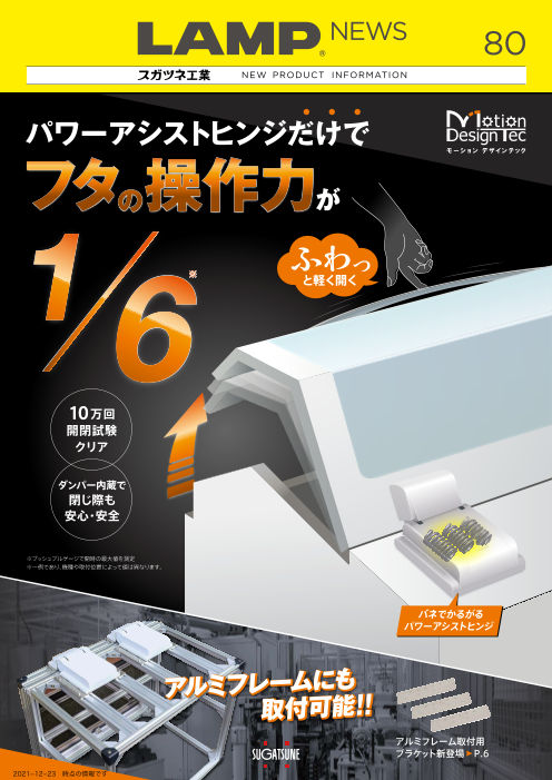 ●ばねのアシストで上蓋を軽く操作できます。 ●アシスト範囲は180°です。 ●保持トルクはトルク調整ナットM6(呼び10スパナ)を回すことで調整できます(0~3.5 N・m)。 ●同梱の樹脂カバーにより本体や取付穴が隠れ、すっきりとした外観になりま...