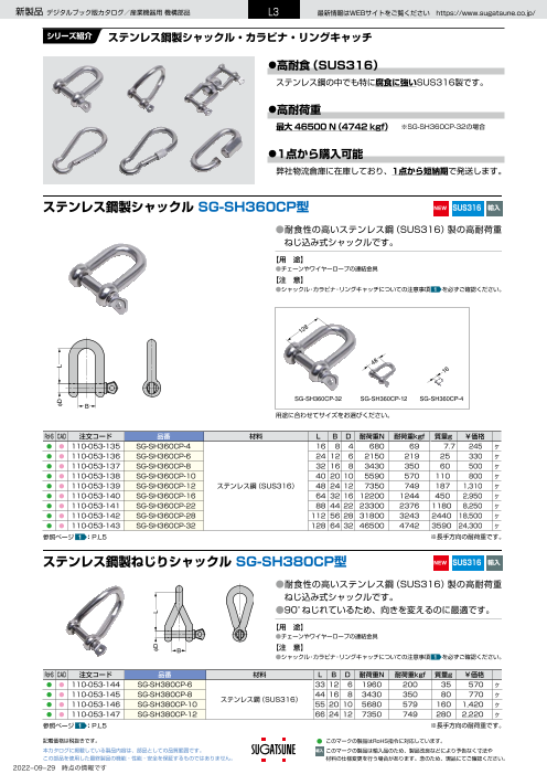 ●高耐食 ステンレス鋼製の中でも特に腐食に強いSUS316製です。 ●高耐荷重 最大46500N(4742kgf) ※ステンレス鋼製シャックル SG-SH360CP-32の場合 ●1点から購入可能 弊社物流倉庫に在庫しており、1...