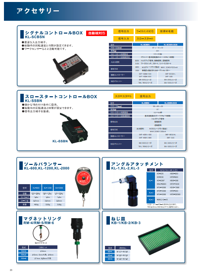 【掲載製品】 シグナルコントロールBOX:KL-SCBSN スロースタートコントロールBOX:KL-SSBN ツールバランサー:KL-600,KL-1200,KL-2000 アングルアタッチメント:KL-1,KL-2,KL-3 マグネットリング...