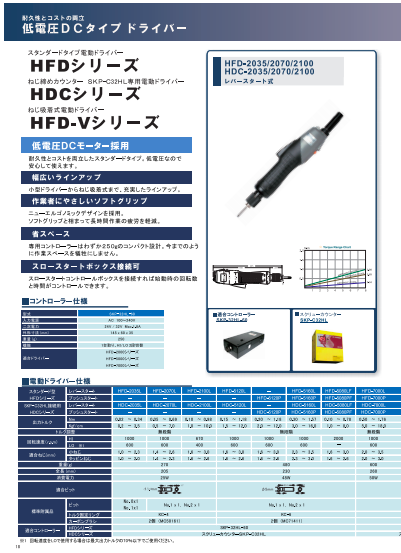 スタンダードタイプ電動ドライバー:HFDシリーズ ねじ締めカウンター SKP-C32HL専用電動ドライバー:HDCシリーズ ねじ吸着式電動ドライバー:DFD-Vシリーズ 耐久性とコストを両立したスタンダードタイプ、低電圧なので安心して使えます。...