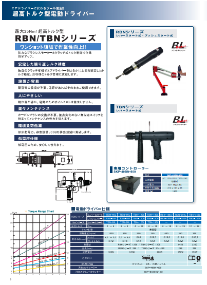 最大35Nm!超高トルク型 RBN/TBNシリーズ ワンショット締結で作業性向上!! 安定した繰り返しルク精度 設置が容易 人にやさしい 楽々メンテナンス 環境負荷低減 低電圧仕様 ◆詳細はカタログをダウンロードしてご覧下さい。