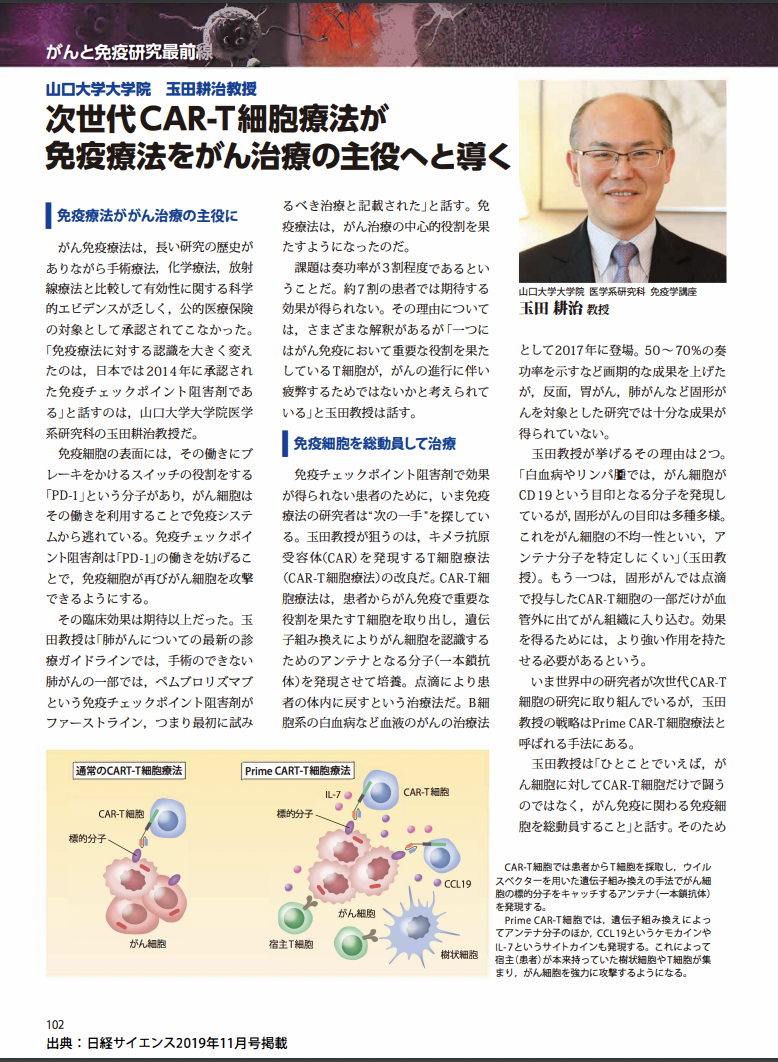 掲載内容 山口大学大学院 玉田耕治教援 次世代CAR-T細胞療法が免疫療法をがん治療の主役へと導く ◆続きはカタログをダウンロードし、ご覧下さい。