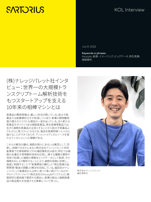株式会社ナレッジパレット福田氏が10年に渡って使い続けているザルトリウス・ジャパン株式会社のIncucyte(R)システム。今回は、細胞研究の最前線で愛用する理由と、新薬の創出と細胞医薬品の高品質化を加速させる事業についてお話を伺いました。 ◆続き...