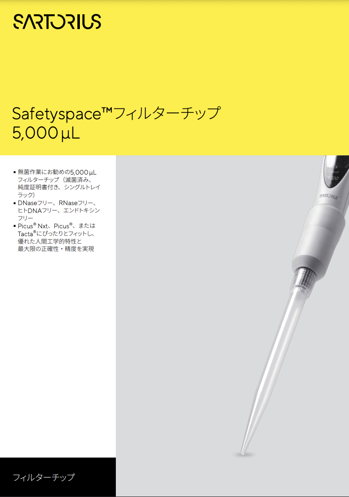 フィルター付きの滅菌済チップを使うことにより、サンプル取扱いのリスクが大幅に低減します。 • 5,000μL、滅菌済、フィルター付きチップ シングルトレイラック(50本入り) • 99.99%を超える細菌ろ過効率がテストされた純粋なポリエチレン...