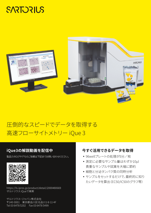 『iQue3』は、従来の多種類の実験法を統合し、短時間で結果を導くハイスループットフローサイトメーター(セルアナライザー)です。 測定に必要なサンプル量はわずか10μLなので、貴重なサンプルや試薬を大幅に節約可能。 浮遊細胞の特性解析と培養上...